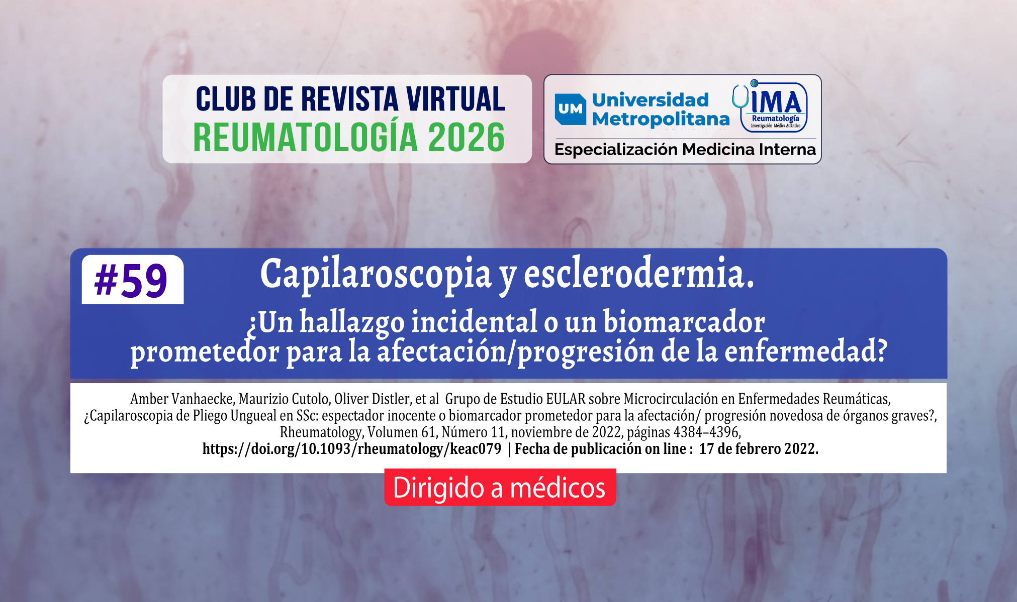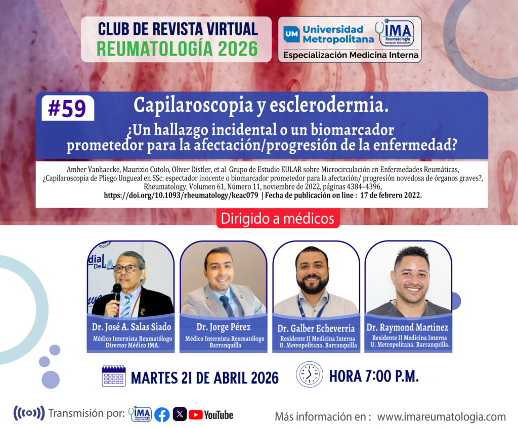 El Club de Revista Virtual de Reumatología 2026, avalado por la Universidad Metropolitana y el Instituto de Reumatología e Inmunología (IMA), presenta una sesión académica de alto impacto sobre los avances en el diagnóstico y seguimiento de la Esclerosis Sistémica.